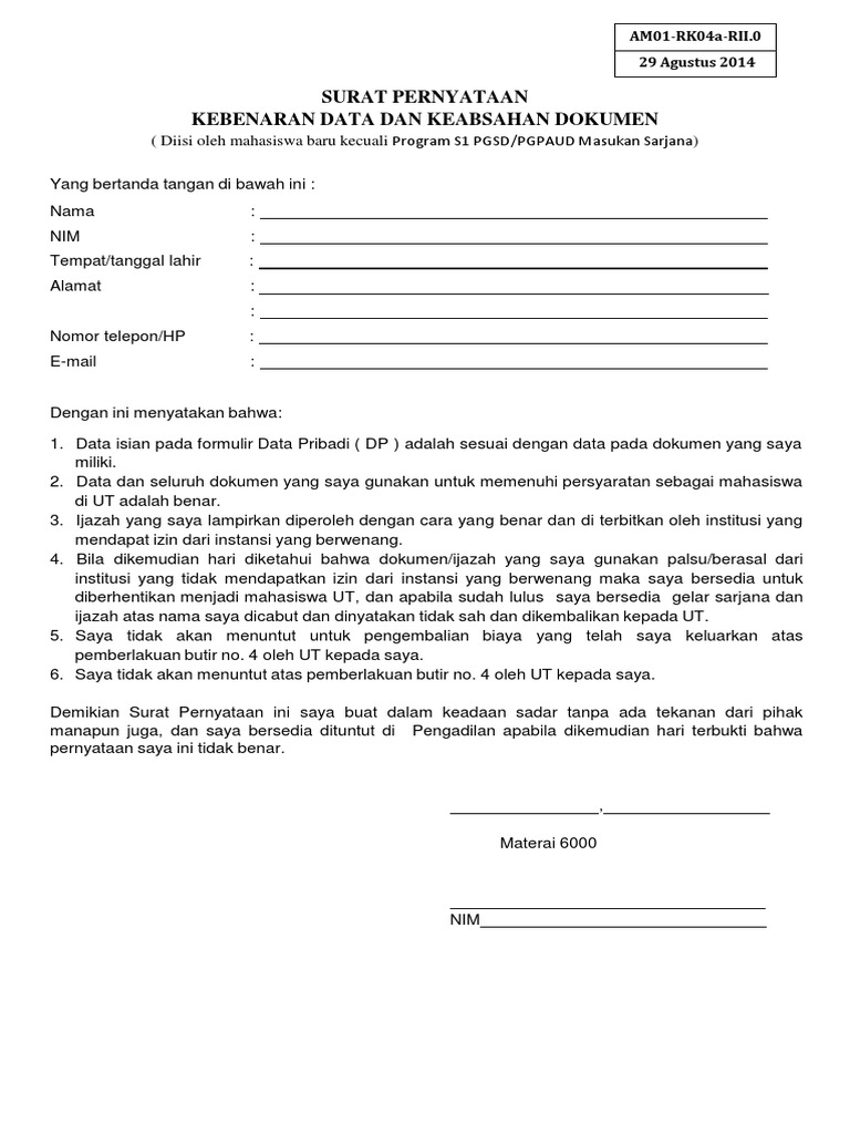 Data dan seluruh dokumen yang saya gunakan untuk memenuhi persyaratan sebagai mahasiswa di ut adalah benar. Yang bertanda tangan di bawah ini oleh mahez 26 jul, 2019 surat pernyataan keabsahan dan kebenaran dokumen yang bertanda tangan dibawah ini : Surat pernyataan keabsahan dan kebenaran dokumen. Semua isi dari surat pernyataan tersebut harus bisa dipertanggung jawabkan tanpa terkecuali, agar bisa memperoleh kepercayaan dari pihak ketiga. Surat pernyataan bahwa dokumen yang kita berikan absah dan benar adanya.